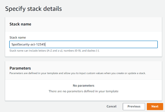 4. You can now verify and/or edit the details. Click Create Stack to create a CloudFormation stack for Spot Security.